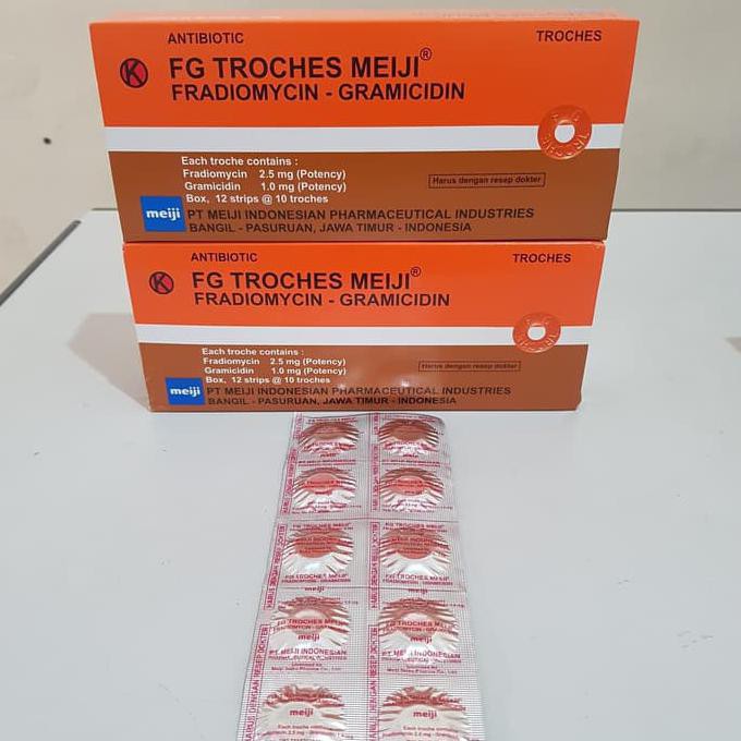 Fg Troches Meiji Dosis Aturan Pakai Efek Sampingnya. Beberapa orang kemungkinan berpotensi mengalami reaksi alergi. Fradiomycin dan garamicidin merupakan kandungan antibiotik yang terdapat di dalam obat hisap fg troches meiji. Fg troches adalah obat yang merupakan kombinasi dari gramicidin dan fradiomycin, di mana keduanya adalah jenis antibiotik. Uses, indications, side effects, dosage. Fradiomisin atau fradiomycin adalah salah satu varian dari antibiotik yang bereaksi terhadap bakteri dari jenis spektrum luas. Kedua bahan dalam fg troches ini dapat membunuh beberapa jenis bakteri. Dua jenis antibiotik tersebut memiliki efek membunuh bakteri dan bersifat spektrum luas. Fg troches adalah obat antibiotik untuk radang tenggorokan dengan kandungan utama fradiomycin dan gramicidin. Fradiomycin berfungsi untuk membunuh bakteri yang berasal dari jenis. Medical information for fradiomycin including its dosage, uses, side, effects, interactions, pictures and the information provided in name of the medicinal productof fradiomycin is based on data of. Frade, fradiomycin b, fradiomycin nippon kayaku. A list of us medications equivalent to fradiomycin sulfate is available on the drugs.com website. Fradiomycin sulfate is a medicine available in a number of countries worldwide. Sp troches meiji adalah obat tablet hisap yang mengandung dua antibiotik, fradiomycin dan gramicidin, obat ini digunakan untuk membunuh bakteri penyebab. Compare prices for generic fradiomycin substitutes: