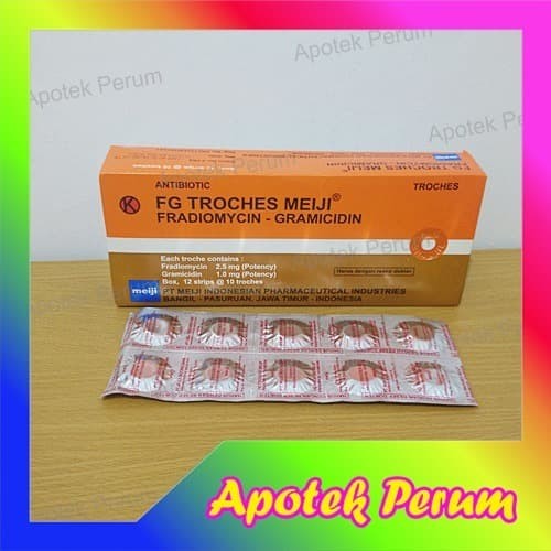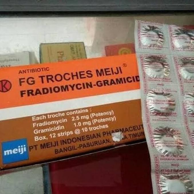Fg Troches Meiji Dosis Aturan Pakai Efek Sampingnya. Fg troches adalah obat antibiotik untuk radang tenggorokan dengan kandungan utama fradiomycin dan gramicidin. Ketahui manfaat, dosis, dan efek sampingnya berikut ini! Komposisi setiap 1 tablet hisap fg troches mengandung : Fradiomycin 2,5 mg gramicidin 1,0 mg farmakologi / cara kerja obat fradiomycin dan gramicidin adalah antibiotik yang mempunyai efek bakterisidal, dan aktif terhadap bakteri staphylococci dan streptococci dan. Fg troches atau fg troches meiji adalah obat tablet hisap dengan bahan antibiotik fradiomycin dan gramicidin. Fg troches adalah obat yang merupakan kombinasi dari gramicidin dan fradiomycin, di mana keduanya adalah jenis antibiotik. Indikasi indikasi fg troches adalah untuk Berapa dosis penggunaannya dan efek samping obat troches itu. Fradiomycin sulfate sulfate oral preparations are contraindicated in patients with inflammatory or ulcerative gastrointestinal disease because of the potential for enhanced gastrointestinal absorption of neomycin. Fg troches meiji merupakan jenis obat antibiotik. Farmakologi / cara kerja obat fradiomycin dan gramicidin adalah antibiotik yang mempunyai efek bakterisidal, dan aktif terhadap bakteri staphylococci dan streptococci dan mempunyai efek aditif. Masih banyak yang menggunakan obat ini tanpa masih sering terdengar pertanyaan mengenai fg troches ini bisa digunakan untuk obat apa saja? Fg troches atau fg troches meiji adalah salah satu obat radang tenggorokan paling populer. Kedua bahan dalam fg troches ini dapat membunuh beberapa jenis bakteri penyebab peradangan di mulut dan tenggorokan. ➠ fg troches meiji fradiomycin gramicidin adalah obat sakit dan radang tenggorokan.